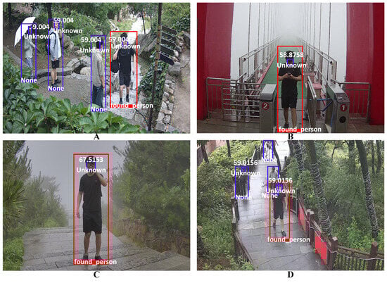 Figure 5 presents the results of target tourist identification utilizing the F2B technology framework in different complex scenarios. In this figure and the rest of the paper, identified tourists are highlighted with red boxes and denoted with the subscript ‘found_person’ or ‘found’, while the remaining tourists are categorized as ‘Unknown’ or ‘None’ and highlighted with blue boxes. Figure 5A,B illustrate the identification results for video frames showing a tourist in profile and in a head-down position, respectively. Figure 5C displays the identification results when facial features are partially occluded. Figure 5D depicts the identification outcomes in a long-distance scenario involving a small target, approximately 50 m from the camera, where only 20 pixels of facial features are discernible, complicating the identification process due to limited facial detail. The results indicate the F2B method effectively facilitates the re-identification of target tourists across a variety of scenes and postures, thereby significantly enhancing the effective identification rate of tourists.
