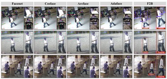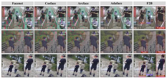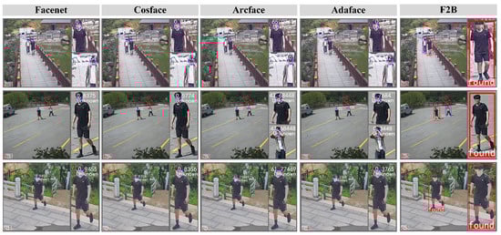 To verify the superiority of the F2B algorithm across various scenarios, we selected four SOTA models, including Facenet, Cosface, ArcFace, and Adaface for comparison. In the tests, the threshold for the F2B algorithm was set at 0.6. The results of these comparisons are presented in Figure 6, Figure 7 and Figure 8.