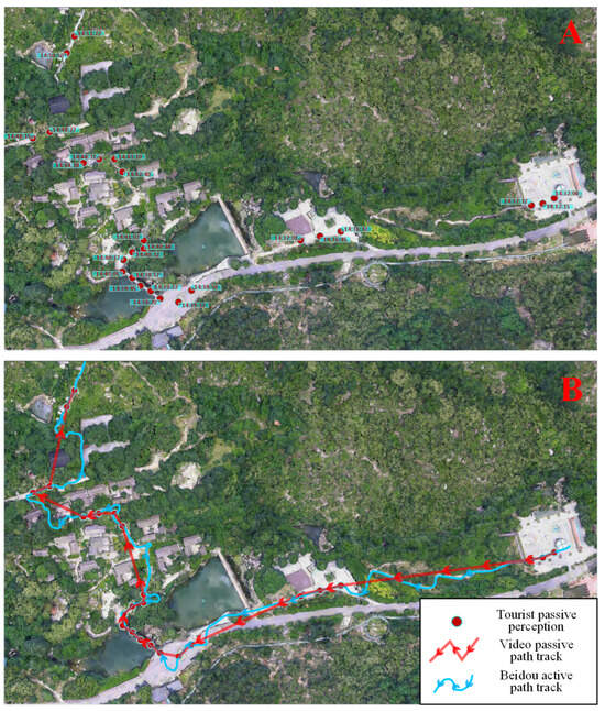 Results of target tourist positioning and tracking ((A) shows that the video positioning algorithm maps the coordinates of the target tourist in the monitoring screen to the real-world effect, and the red trajectory in (B) is the video screen passive positioning trajectory connected to the set of target tourists’ coordinate points; the blue trajectory is the satellite active positioning trajectory).