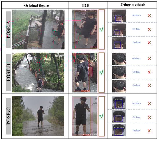 In the context of re-identification with multi-feature coupling, the acquired datasets of facial and body feature are cascaded using the Hungarian algorithm. The efficiency, stability, and accuracy of this algorithm enable it to perform feature matching more effectively than other algorithms that address the maximum matching problem in bipartite graphs. In the tourist re-identification module, a re-identification model trained with the Fast-ReID framework is employed to extract features from the captured video stream and match them with the facial and body features in the feature set. Multiple iterations of the Fast-ReID architecture, including the aggregation module, head network, loss function, distance metric, and post-processing are utilized to ensure the accuracy of the output results. Compared to traditional face recognition methods, the F2B algorithm significantly enhances the acquisition of effective information, thereby improving identification accuracy and robustness. Additionally, the F2B algorithm not only addresses the challenges posed by small targets at long distances but also demonstrates commendable identification performance for non-cooperative subjects in various postures, such as when the target’s head is down or turned away, as illustrated in Figure 10.