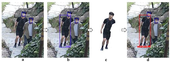 The sources of error in passive perception and path tracking for tourists to mountain scenic spots primarily arise from two factors: identification accuracy and localization tracking accuracy. Regarding identification accuracy, errors mainly arise from the considerable distance between the camera and the detected target, which typically results in low pixel feature resolution in the images captured by the camera []. Even with state-of-the-art detectors, a significant performance gap persists in detecting small and normally sized objects, largely due to the inevitable loss of small target representations during feature mapping downsampling [,,,]. Furthermore, the identification results of F2B depend upon the detection frame, which can be negatively impacted by the presence of other individuals in high crowd density situations. This may lead to inaccuracies in the features read, subsequently compromising identification accuracy, as illustrated in Figure 11. In Figure 11b, while the detection frame for the tourist in black is established, face recognition fails to identify them due to the bodies of other tourists in the background introducing real-world noise that detracts from F2B recognition accuracy, ultimately resulting in failure to identify the target. However, once the target is accurately segmented by edges (Figure 11c) and the features are subsequently read, successful identification can be achieved (Figure 11d).