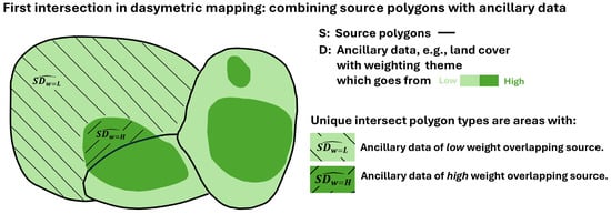 For an extensive variable such as the human population that is dependent on areal variations during spatial interpolation [18], the first intersection step visualised in Figure 1, enables the calculation of Formula (1) that takes each ancillary data-specific input weight and transforms it into a weight of each intersect polygon .