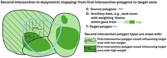 Inspired by a figure in Hansen [18] and a figure in Flowerdew et al. [5], a visual presentation of the two spatial intersections needed to carry out dasymetric mapping is presented in Figure 1 and Figure 2. We want to be able to use the distribution of one or more ancillary data D, e.g., land cover (here: CORINE), to distribute known values of a variable (here: human population P) of sources S to targets T. The first intersection involves combining the source data and ancillary data. The second intersection involves combining the results of the first intersection with the target data.