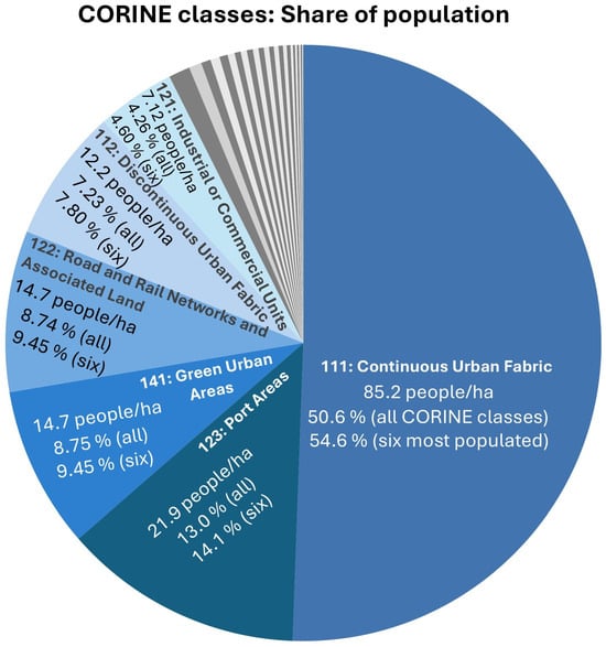 The area-weighted population share in percentages within each region of the six most populated CORINE classes, according to the EU Census Grid mapping.