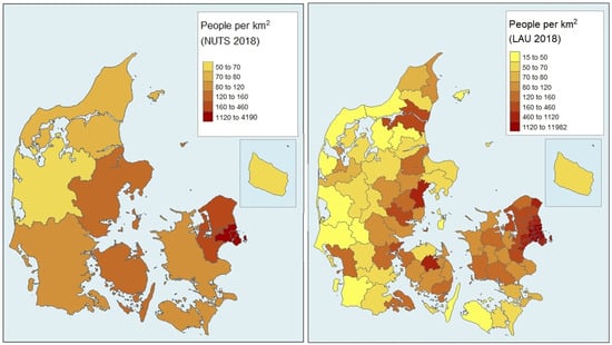 The dasymetric mapping method, whether it being top-down or bottom-up, allows for flexibilities in polygon resolutions and shapes [18]. However, the spatial resolutions of the source layer, of the ancillary layer(s), and of the target layer determine the quality of the dasymetric mapping output. Socioeconomic data typically requires a minimum mapping unit size due to confidentiality issues [18]. Multiple papers choose a cell-based approach where the target zones are of equal sizes and shapes and are not dependent on administrative borders, e.g., [18]. In this paper, the municipality level represented by Eurostat’s Local Administrative Units (LAU) level will constitute the target extent, since the control data to assess and compare the algorithms is population at the municipality level. Evaluating the algorithms for Denmark will indicate their applicability as models for quickly calculating population across, e.g., national borders, and interpolate to other areas of interest.