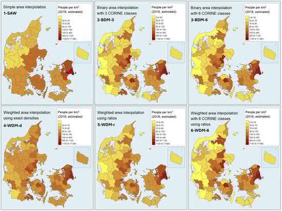 The estimated Danish LAU (municipality) 2018 population for each dasymetric mapping algorithm, using the same classification as in Figure 4.
