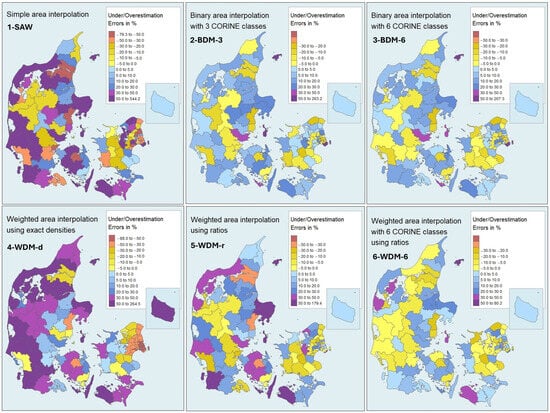 Figure 6 shows a map series with the overestimations and underestimations in percentages for each error calculated per municipality polygon for each algorithm. A general trend to lower under- and overestimations seems to be the case for the algorithms 2-BDM-3, 3-BDM-6, and 6-WDM-6, matching the visual exploration of the population density maps. However, the WDM-r appears to have more higher errors than when only exploring its visual population density map resemblance with control data.