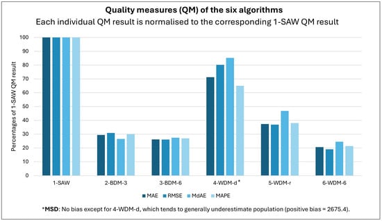 The four of the five quality measures of MAE, RMSE, MdAE, and MAPE are presented in Figure 7 where each of these measures are individually normalised based on 1-SAW making up 100% of the error scale. The lower the measure, the better the statistical fit of the algorithms compared to the control data.