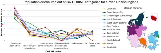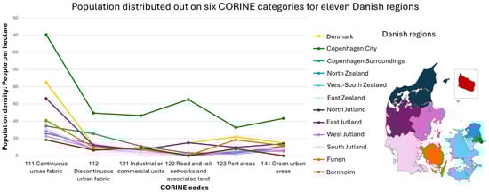 The population densities from the EU Census Grid mapping for the six most populated CORINE classes across all Danish regions.