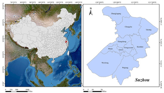 Suzhou City is located in the Yangtze River Delta region, in Eastern China. It lies in the southeastern part of Jiangsu Province and benefits from a strategic geographic location with excellent transportation connections. The study area is situated within an economically developed region, characterised by a rich natural resource base and a diversified economic landscape. The city of Suzhou is undergoing a rapid process of urbanisation, accompanied by a high population density, particularly in the urban area and the surrounding industrial parks, where a considerable number of people are concentrated. As illustrated in Figure 1, at the conclusion of 2020, Suzhou encompassed five districts, namely Gusu District, Huqiu District (Hi-Tech District), Wuzhong District, Xiangcheng District, and Wujiang District, in addition to the Suzhou Industrial Park. Furthermore, four county-level cities were under the indirect administration of Zhangjiagang, Changshu, Taicang, and Kunshan. The city is comprised of 42 streets and 52 townships.