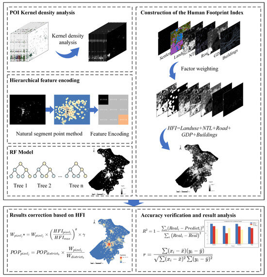 The objective of this study is to construct an optimised population spatialisation model by combining the Human Footprint Index (HFI) and the hierarchical feature coding method. This approach is intended to enhance the accuracy of population prediction in areas with different population densities. In particular, the study initially collates pertinent demographic and spatial data for Suzhou City. Following this, a kernel density analysis of the POI data is conducted, after which a hierarchical feature coding method is employed to process the input POI features. This is performed in order to more effectively capture the complexity of the population distribution within different regions. The initial predicted population spatial distribution weights were obtained through the application of a random forest model. To address the issue of data smoothing that is often associated with random forest, the study considers the characteristics of human activities within the study area and constructs HFI to correct these data, thereby reflecting the impact of human activities on population distribution. The final step is to evaluate the efficacy of the proposed model in enhancing prediction accuracy. This is achieved by comparing it with the traditional random forest model and the international public dataset (WorldPop). The technology roadmap is illustrated in Figure 2.
