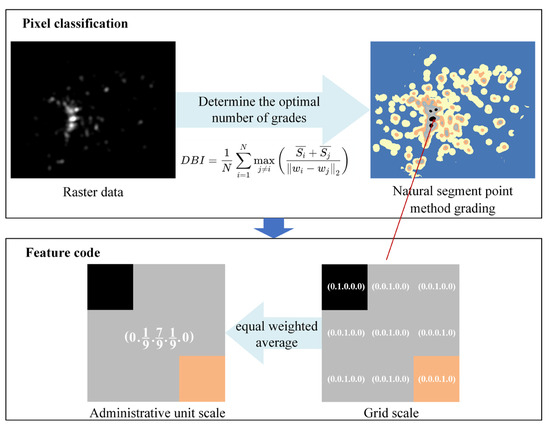 The fundamental principle of hierarchical feature coding is the establishment of consistent classification criteria for raster data at varying scales, thereby facilitating the integration and unified analysis of multi-scale information. The process of hierarchical feature coding enables the capture of the multi-level structure of the data in greater detail by dividing the original features into multiple classes. The natural breaks method can divide intervals based on the internal characteristics of the data, effectively highlighting regions of natural clustering for high or low-frequency values, thus more accurately representing the distribution characteristics of different data. In particular, this study initially employs the natural breakpoint method to categorise feature values into k + 1 levels. This entails transforming continuous data into discrete and comparable levels through hierarchical processing. Subsequently, the optimal number of levels is determined using the Davies-Bouldin index (DBI). This process ensures variability and representativeness among the grades, thus enhancing the expressiveness of the features. The DBI is calculated in accordance with the following equation:
