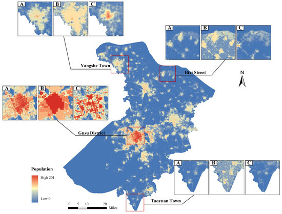 Spatialised dataset of population in Suzhou based on HFI correction (HFIPop). (A) is the spatialisation of the population dataset based on the Human Footprint Index correction (HFIPop), (B) is the spatialisation of population dataset based on traditional RF model projections (RFPop), and (C) is the WorldPop dataset).