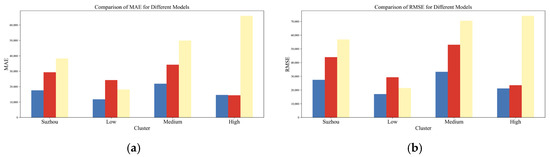 In order to explore the applicability of the method proposed in this study in different population density regions, the K-Means clustering method is employed to divide the streets of Suzhou City into three types of population density zones: high, medium, and low. Furthermore, the differences in the performance of the HFIPop, RFPop, and WorldPop datasets in these zones are validated. The results are presented in Figure 7, which demonstrates that there are notable discrepancies in the performance of each model across different population density regions.