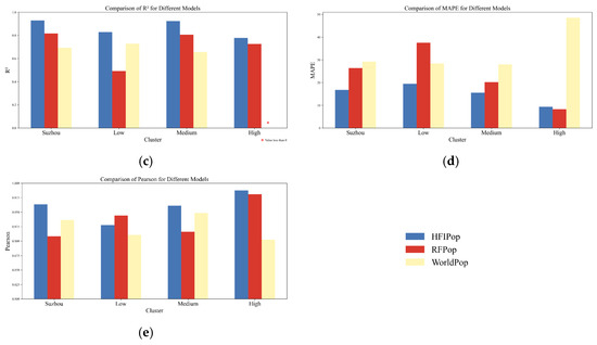 In the low- and medium-density regions, the HFIPop model demonstrates superior performance across several key metrics. Notably, the MAE and RMSE values of HFIPop in both regions (low: 11,782.29 and 17,036.44; medium: 21,946.35 and 33,278.59) are substantially lower than those of RFPop and WorldPop, indicating a more accurate prediction of population distribution. The MAPE for HFIPop in both low- (19.46%) and medium- (15.53%) density regions is also markedly lower than that of RFPop and WorldPop, reflecting better consistency in percentage error. Moreover, the R2 values of HFIPop in these regions (low: 0.83; medium: 0.92) are higher than those of the competing models, demonstrating HFIPop’s superior ability to explain the variance in population distribution. The Pearson correlation coefficients of HFIPop in the low- and medium-density regions (0.93 and 0.96, respectively) further support this, indicating a stronger linear relationship with the actual population data compared to RFPop and WorldPop. In contrast, in the high-density region, while the MAE and RMSE of HFIPop (14,632.35 and 21,156.01) remain lower than those of WorldPop (65,991.97 and 74,109.70), they are slightly higher than RFPop’s values (14,268.37 and 23,286.11), indicating a more balanced performance. Despite this, HFIPop’s MAPE (9.33%) remains lower than WorldPop’s (48.54%), emphasizing its superior accuracy in high-density areas. The R2 value of HFIPop in the high-density region (0.78) is significantly higher than that of WorldPop (−1.72), suggesting that HFIPop is more reliable in explaining population distribution in this region. Furthermore, the Pearson coefficient of HFIPop in the high-density region (0.99) is notably higher than both RFPop (0.98) and WorldPop (0.90), reinforcing the conclusion that HFIPop better captures the spatial distribution in high-density areas.