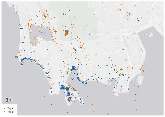 Location of Flickr posts tagged with variations in the names of either Cristo Redentor (“Tag A”) or the Sugarloaf Mountain (“Tag B”) in Rio de Janeiro. The spatial distribution of points in this dataset mainly originates from the popularity of the places and not only in the quality of their line of sight toward the two landmarks. Therefore, it is not possible to derive the best photo spots just from the number of posts at the respective locations.