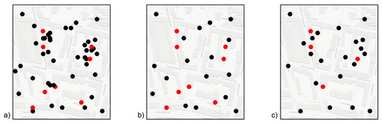 The aforementioned operations focus on the first task of map generalization—increasing map legibility—mainly by removing a certain amount of points. By contrast, preserving the present information of the point data as much as possible is the second task of map generalization—and possibly contradicting the first. Thereby, the question arises as to which spatial point patterns are of interest. A study conducted by Knura and Schiewe [9] analyzed user behavior when interpreting spatial point patterns and thereby revealed two main aspects. First, the proportion of points between different patterns, as well as between dense and sparse areas, was crucial for the task-solving process of the participants. Second, the proportion between different classes within an area—or their respective absence—was frequently described during decision-making. As a result of this study, point pattern preservation can be described as a multi-criteria decision, a technique that has already been proposed in cartography for specific tasks within the workflow of automated map generalization [17] and for class interval selection [18]. Based on the latter work on choropleth maps, Chang and Schiewe [19] were able to preserve spatial patterns such as local extreme values and hot or cold spots. As an example of preserving a spatial point pattern for visualization purposes, Qiang et al. [20] used a pyramid modeling framework and point density metrics in their work. For some applications, it could also be useful to visualize point patterns with respect to other geometry objects, such as street networks [21]. To the best of our knowledge, approaches for point pattern preservation with respect to point density and local extreme values are still missing.