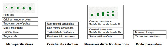 Figure 4 lists the different types of parameters that have to be defined before running the agent-based model. In addition to the aforementioned global map specifications, the basic model parameters, and a list of constraints, as presented in Table 1, the definition of, reasonable threshold values are essential for the success of an agent-based map generalization model, but it is also a complex task. To help with this process of model parametrization, we adapted an approach of Taillandier and Gaffuri [29] using a human–machine dialogue. Therefore, we offer a guided user interface to adjust the thresholds for each measure satisfaction function and visualize the impact of selected thresholds via samples on a map to obtain a better understanding of the impacts of the thresholds on the constraint satisfaction and on the expected results of the generalization process in general. For example, decreasing the threshold values for the minimum distance between agents ensures that the agents are more likely to decide to perform generalization operations that improve their satisfaction regarding this measure, such as increasing the distance to their neighbors using displacement, or deleting themselves as a result of a selection operation. As a result, the distance between individual agents will likely increase on the final map, while the number of points will decrease.