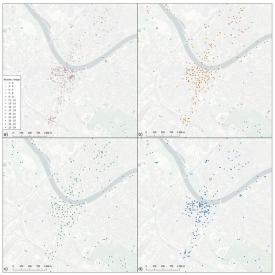 - Knura, M.; Kluger, F.; Zahtila, M.; Schiewe, J.; Rosenhahn, B.; Burghardt, D. Using Object Detection on Social Media Images for Urban Bicycle Infrastructure Planning: A Case Study of Dresden. ISPRS Int. J. Geo-Inf. 2021, 10, 733. [Google Scholar] [CrossRef]
