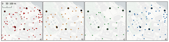 Detailed view of the generalization results around the Theaterplatz. (a) Original data, (b) quad tree generalization, (c) discrete isolation algorithm, (d) our agent-based model. Original positions of extreme values are highlighted with a big black dot.