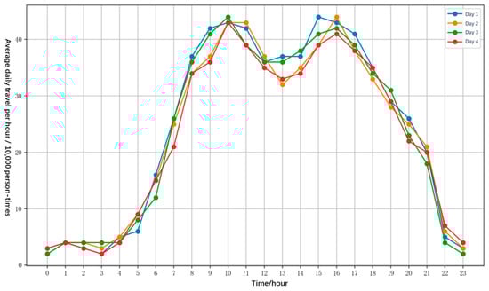 Based on a preliminary examination of the gathered data, it can be seen from Figure 1 that user routes show obvious patterns and similarities, with the majority of movement taking place between 6 a.m. and 9 p.m. Between 10 a.m. and 1 p.m., there is a discernible drop in the volume of movement. This is probably because this time frame falls around lunchtime, when users may stop doing anything, which also lowers the rate of trip. Between 4 p.m. and 9 p.m., there is a considerable reduction in travel, which might be attributed to consumers relaxing at home.