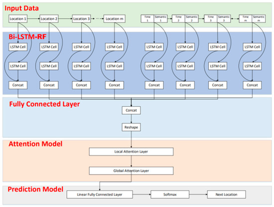 In this study, we propose a BiLSTM-RF model based on mobile signaling data. Using mobile signaling data as the foundational dataset, we construct a frequent semantic dataset for users as input to the BiLSTM-RF model, aiming to predict users’ next locations in their movement processes. This model integrates user behavior, a multi-layer attention mechanism, and a bidirectional long short-term memory network. The model framework is illustrated in Figure 2.