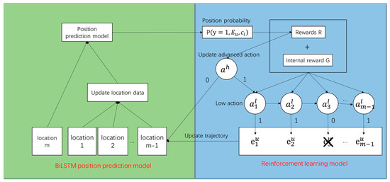 While basic user trajectory location prediction models can estimate the weights of each historical location, the influence related to the target location may be diluted by unrelated trajectories when users leave footprints in many different places. To address this issue, actions are divided into low-level actions and high-level actions, which, respectively, focus on individual adjustments of historical trajectories and global adjustments of the entire user profile. As shown in Figure 3, by embedding reinforcement learning into the BiLSTM-RF location prediction model, we use the location probabilities of the location prediction model as the input. Through hierarchical reinforcement learning, low-level and high-level actions modify the trajectory file, thus updating the trajectory, which ultimately updates the position data in the location prediction model. This process continually trains the model to enhance its user location prediction capability.