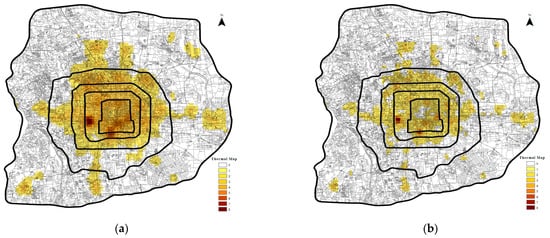 Competitiveness represents the relationship between the types of POIs being considered and existing POIs of the same type in the area. The more POIs of the same type, the fiercer the competition; thus, competitiveness has a negative correlation with commercial site selection [38,39,40]. Competitiveness is represented by Equation (14), as follows: