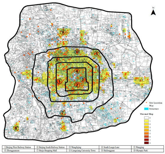 The site selection results are presented in Figure 5. The point location results indicate that the optimal areas for selecting commercial sites are primarily found in the central urban area within the Fourth Ring Road. These locations are divided into four categories: (1) Olympic Park, Wangfujing, South luogu Lane, and other places in the figure that are convenient for transportation, have complete catering and entertainment facilities, and are part of the well-known culture and entertainment industry zone in Beijing. (2) Beijing West Railway Station, Beijing South Railway Station, and Beijing Railway Station are passenger and logistics distribution centers. These locations have high year-round population mobility and overly dense crowd distribution, resulting in a higher weighting of the location in the algorithm and therefore more recommended points. (3) Liangxiang, Tongzhou, Daxing, etc., have gradually increased their commercial development due to the construction of Beijing’s subcenters and the relocation of some universities. This area has high commercial value and layout potential. (4) Huiju Shopping Mall, Wangjing, and other mega shopping centers are also recommended because of their high prosperity and huge customer flow.