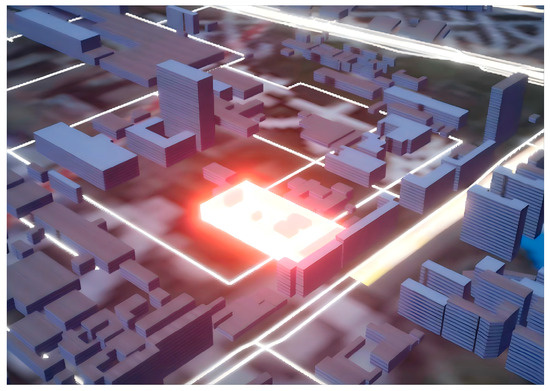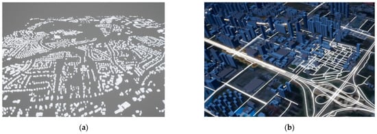 Before creating a city model, it is necessary to collect geographic information data for buildings and roads, use QGIS 3.22.8 to add height fields to the building data, and retain major sections in the road data. Next, the 2D geographic data are converted into a 3D model by converting the file into a 3D model in Blender 2.93 adjusting the height of the 3D model according to the height field of the buildings, and generating a NURBS path model for the road data (Figure 6a).