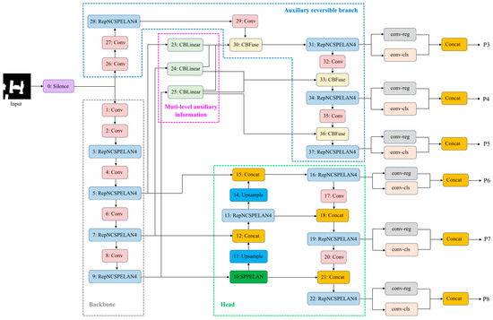 YOLOv9 is a significant iteration of the YOLO series by Chien-Yao Wang et al. [46]. As part of the Yolo family in object detection, Yolov9 builds upon its predecessors by incorporating novel architectural enhancements and optimization techniques, thereby improving both detection accuracy and computational efficiency. YOLOv9 achieves this balance by leveraging a deep convolutional neural network (CNN) architecture that enables the simultaneous prediction of bounding boxes and class probabilities in a single forward pass, thus streamlining the detection process. The network architecture of YOLOv9 is shown in Figure 2.