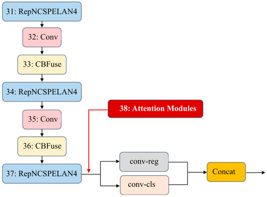 The attention mechanism is a technique used in deep learning models that allows the model to selectively focus on specific areas of the input data when making predictions [47]. This mechanism, inspired by the human mental process of selective focus, has emerged as a pillar in a variety of applications, accelerating developments in natural language processing, computer vision, and beyond [48]. The introduction of an attention mechanism in object detection can make the model focus on the key information of the image, filter irrelevant information, and save computing resources. At the same time, the detection effect of the model on small targets can be improved. In this paper, SE, CBAM, NAM, and SimAM attention modules are, respectively, introduced into the red box position, as shown in Figure 4, and their performance improvements are compared.