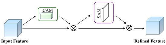 CBAM (convolutional block attention module) mainly includes two sequential submodules: the channel attention module (CAM) and the spatial attention module (SAM) [50]. Based on the input feature map, CBAM successively integrates the attention weights along the channel and spatial modules and multiplies the input features, respectively, to obtain new features in order to extract important information from the feature map. Its basic structure is shown in Figure 6.