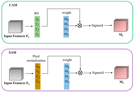 NAM (normalization-based attention module) uses the contribution factor of weight to improve the performance of the attention mechanism [51]. NAM uses batch-normalized scale factors to represent the importance of weights, which can effectively avoid the full connection layer and convolutional layer used by SE and CBAM modules. That is, NAM uses CBAM’s module integration, redesigns the channel and spatial attention submodules, and then empowers the NAM module at the end of each network block. For the channel attention submodule, the scale factor in batch normalization is used, and the channel variance is calculated by the scale factor as the basis to measure the importance of weight. The structures of CAM and SAM are shown in Figure 7.
