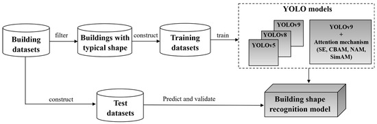 The overall procedure of the proposed method is described as follows: First, the buildings with typical shape types are filtered out from the building data, and the training datasets are constructed accordingly. To compare the performance of different YOLO models, another two significant update versions of the YOLO series, namely YOLOv5 and YOLOv8, are also selected and trained to compare with YOLOv9 and attention mechanism models, ultimately resulting in the corresponding building shape recognition models. An initial building dataset is used to construct a test dataset, on which the trained building shape recognition models are predicted and validated. The detection and recognition effects of different models are compared. The overall process is shown in Figure 9.