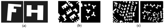 After training, the model is applied to a new area’s test dataset for prediction and validation. Compared to the training dataset, where each image contains only one type of building shape, the test dataset further increases the complexity and richness of the detection task. Three-level test datasets with different complexity were constructed to verify the training effectiveness and recognition capability of the model (Figure 10).