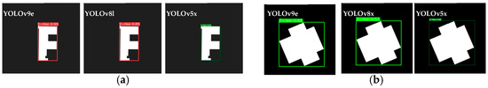 The detection results of different YOLO models on Test Dataset 1 are statistically analyzed for precision and recall rate by shape type (as shown in Table 9). Among the selected eight typical building shape types, the L-like, H-like, T-like, Y-like, and Z-like buildings have better recognition accuracy. This is because the features of these building shape types are relatively prominent, making it easier for the model to extract their features. The errors mainly occur in two aspects: one is the misidentification between E-like and F-like buildings. These two shape types are similar and easy to confuse, especially since the small convex and concave building contours can interfere with the model’s judgment (Figure 11a). Another one is the misidentifying of the cross-like buildings as Z-like. This is particularly evident in “chubby” cross-like buildings, which are relatively similar to Z-like buildings and can easily lead to misidentification (Figure 11b). In terms of recall, the L-like buildings have a relatively low recall rate. This is because, compared to other types, the shape of L-like buildings is simpler, and the model can extract relatively less feature information, making it more prone to missed detections.