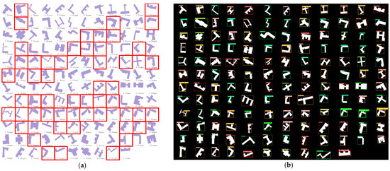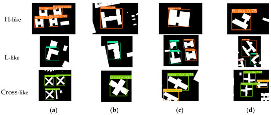 Edge detection ability: It can identify shapes at the edge positions of the image. For example, in Figure 13b, there are incomplete E-like and T-like buildings at the edge positions. The YOLO model can determine the type from incomplete local information.