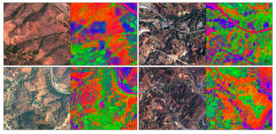 - Impact of Endmember Selection: The choice of endmember selection methods influences estimation accuracy in the study area. The RGB color composite image derived from the Minimum-Volume Enclosing Endmember method (MVE) tends to be darker, indicating that MVE overestimates the fraction of different vegetation types compared to BS. In contrast, the Pixel Purity Index (PPI) method provides higher accuracy, due to better spectral purity and more precise endmember identification. Therefore, it is recommended to prioritize the PPI method in similar studies to improve estimation accuracy.