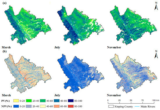 - Spatiotemporal Distribution of NPV: fPV shows higher levels in the valley than in the western high-altitude areas. During the dry season, PV transitions into NPV, concentrating in the valley and low-altitude urban areas. In the rainy season, fNPV decreases, with a slight increase in cultivated areas after the rain. These seasonal variations reflect regional vegetation phenology, supporting rapid vegetation monitoring and spatiotemporal analyses in dry–hot valley regions.