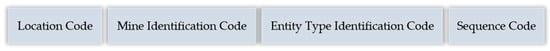 Being the unique identity of mining entities, the mining entity code is the basis for entity model integration, thematic connection, data extraction, analysis, and sharing and can reflect the spatial location and category attributes of entities to a certain extent. The basic geographic entity code can realize the global proprietary unique identification of basic geographic entities and a new type of association sharing [21], but it is difficult to realize the detailed description and identification of mining entities in the existing classification and coding system. Based on this, this study combined the characteristics of mining entities to design a mining entity coding scheme that consists of a location code, mine identification code, entity type identification code, and sequence code, as shown in Figure 2.