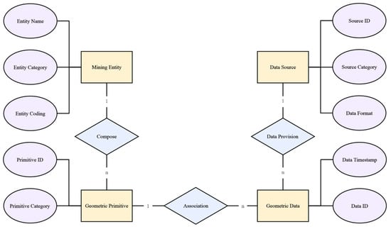 To visually present the organizational framework of mine entity geometric data, a simplified ER diagram was designed as shown in Figure 3. A mine entity consists of one or more geometric primitives, each with a unique entity code and related semantic attributes. Every primitive has a unique primitive ID and includes basic types such as points, lines, surfaces, and volumes.