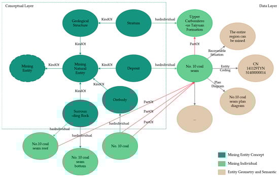 The conceptual layer of the mining entity and data layer of the mining entity were combined to construct a schematic diagram, as shown in Figure 7. The conceptual layer realizes the knowledge representation modeling of mining concepts, geometries, semantics, and relationships. The data layer adds concrete instances on the basis of the conceptual layer. Different color nodes indicate different levels of mining concepts and entities; for example, “Mining Entity–Natural Mining Entity–Deposit–No.10 Coal Seam” realizes the connection from mining entity type to mining individual. The data layer is a detailed description of the relationships and geometric and semantic associations between mining entities; for example, the No.10 coal seam is part of the Upper Carboniferous Taiyuan Formation and, at the same time, consists of the No.10 coal seam top plate, bottom plate, and No.10 coal, which has attributes such as retained reserves, recoverable conditions, and geometric representations such as a planar diagram and a three-dimensional model. The entity semantic information in the figure all possesses the timestamp attribute added in the equation. However, in the database, the “timestamp” is stored as an edge attribute and needs to be viewed in the database’s sidebar. Therefore, we do not display the timestamp information for the relevant attributes in Figure 7.