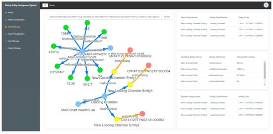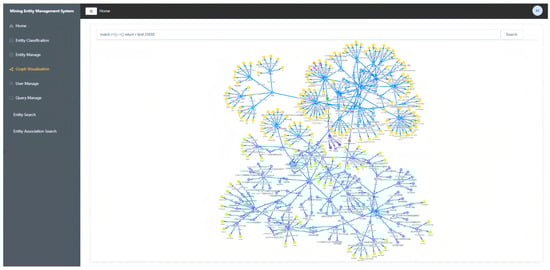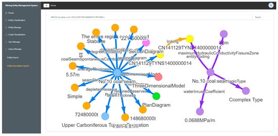 The mining entity graphical visualization module is based on the Neo4j graph database and Vue.js framework, combined with the Neovis.js database, which realizes the visualization of the mine entity graph in the system interface, as shown in Figure 9, which clearly and intuitively displays all the mining entities, attributes, and relationships in the database and enables the user to quickly browse through the data profiling in the mining entity database through the interactive function, improving the user’s data understanding and application efficiency.