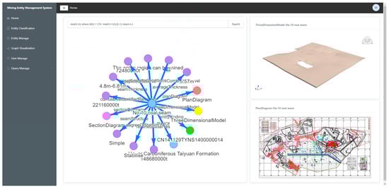 The mining entity graph database can store and display mining entity attributes and relationships in a determined form, and in order to facilitate the understanding and verification of the feasibility of organizing and managing mines in the form of entities, a prototype system for mining entity management based on a graph database was designed. The system consists of four main functional modules: mining entity graphical visualization, entity query and retrieval, entity knowledge association, and entity database management. The main interface of the system is shown in Figure 8.