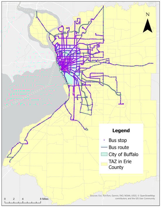 Erie County, New York (NY) was chosen as the study area, which had a total population of 954,236 in 2020 []. The Buffalo–Niagara Falls Metropolitan Statistical Area, encompassing Erie County and Niagara County in Western New York, is the second-largest metropolitan area in New York State. It concentrated on the urbanized area of Buffalo, where the Niagara Frontier Transportation Authority (NFTA) is the major transit agency responsible for the public transportation oversight of both counties. Figure 1 shows 57 bus routes operated by NFTA and the bus stops within Erie County.