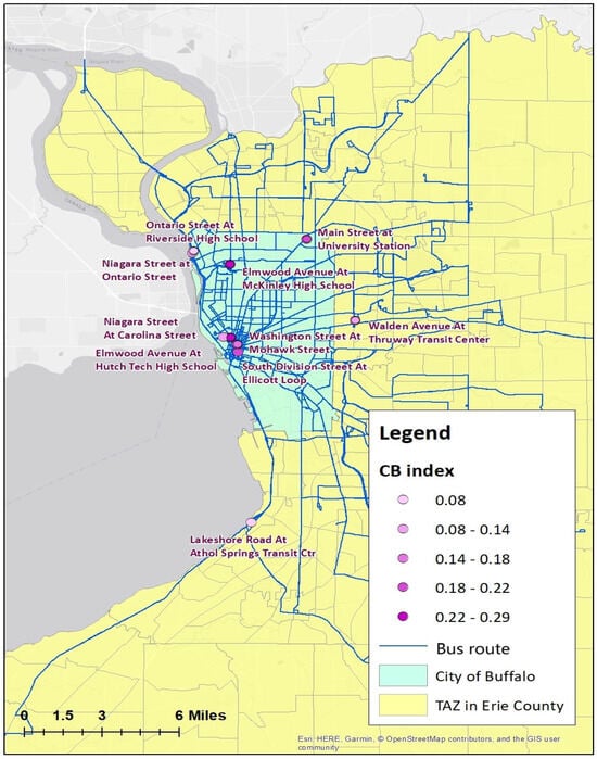 where (i) represents the number of shortest paths between bus stop (s) to bus stop (t) through the bus stop (i). The current bus stops include multiple bus routes overlaid, and hence, (i) calculations were made with NFTA’s bus route and bus stop information and combined into the GIS database. The CB index is a metric that quantifies the number of shortest paths passing through a bus stop, highlighting its importance within the bus network []. A higher CB index indicates greater significance for a bus stop. Figure 2 showcases the top 10 most critical bus stops, identified by their highest CB indices, within the NFTA-operated bus network, all located within the Buffalo city boundary.