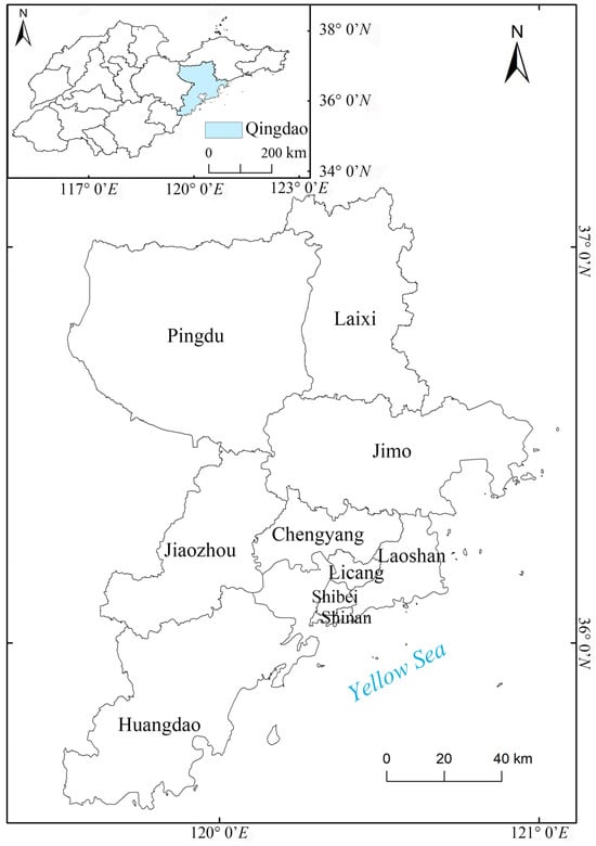 Qingdao, Shandong Province, China, is located on the eastern Yellow Sea coast, southwest of the Shandong Peninsula (Figure 1). It is an important coastal tourist city in China. Qingdao’s climate is a temperate monsoon climate deeply influenced by the sea, with four distinct seasons, abundant rainfall, and a variety of terrain types. As of the end of 2023, there are 100 A-grade scenic spots, 2 national wetland parks, 207 intangible cultural heritages, and 39 state-owned museums in the city of Qingdao, so it is diverse in terms of the types of tourist attractions [43]. Qingdao’s total tourism revenue was RMB 100.64 billion in 2022, accounting for 6.74 percent of the city’s GDP. This is significantly higher than the amount of China’s total tourism revenue as a share of China’s GDP in 2022, which is 1.69 percent [44].