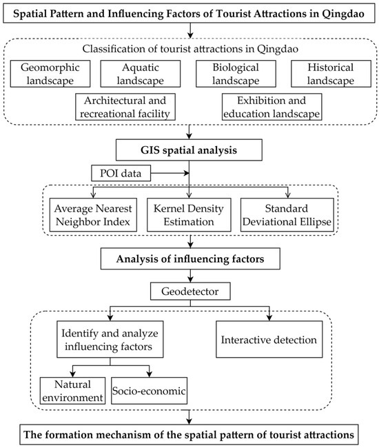 This study was based on GIS, using average nearest neighbor index, kernel density estimation, and standard deviational ellipse to visualize the spatial distribution characteristics of tourist attractions in terms of spatial distribution type, distribution density, and spatial pattern. It also combines Geodetector to analyze the factors affecting the spatial distribution of tourist attractions from both natural and social dimensions. In addition, this study analyzes the formation mechanism of the spatial pattern of tourist attractions based on the support of path dependence theory, realizing the combination of qualitative analysis and quantitative methods (Figure 2).