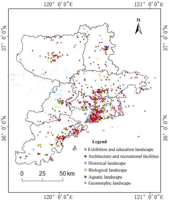 Referring to the Classification, Investigation and Evaluation of Tourism Resources (GB/T18972-2017) [49], and combined with existing literature [46,50], the POI data of tourist attractions are divided into six categories (Table 1). The geomorphic landscapes, characterized by distinctive topographical features and natural geographical formations, encompass 157 attractions, making up 10.48% of the total. The aquatic landscapes, which are shaped by rivers, lakes, wetlands, and marine recreational zones, account for 93 attractions, constituting 6.21%. Attractions classified as biological landscapes, which include diverse flora, fauna, and their habitats, total 134. The historical landscapes, which include ancient buildings and other cultural relics, equate to 207 and contribute 13.82%. Dominating the classification are architectural and recreational facilities, such as modern structures and leisure venues, which comprise 842 attractions and constitute a substantial 56.21% of the total. Exhibition and educational landscapes mainly refer to public places for the dissemination of scientific knowledge, and the smallest number of attractions are in this category, with only 65 attractions. Due to the non-formation of tourism resources categorized as weather and climate landscape in Qingdao’s tourist attractions, and the inability of tourism commodity category and human activities category tourism resources to develop into long-lasting and effective tourist resources, they are not reflected in the classification of POI data for tourist attractions. The spatial distribution is shown in Figure 3.